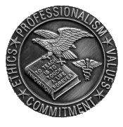 The front of the coin was designed by MSG Cook, MSG McClain and Ms Emerich. The outer ring displaying the words Professionalism, Values, Commitment and Ethics depicts some of the principles of the Radiology Technologist. The center of the ring displays an Eagle, symbolizing the U.S. Army soldier. The Book with the inscription "To teach is to touch a life forever" is dedicated to the teaching and mentoring which will help build the individual and the soldier, "Innovation" which eludes to the space left open for an individuals unique and creative talents. The caduceus represents the Army Medical Field.