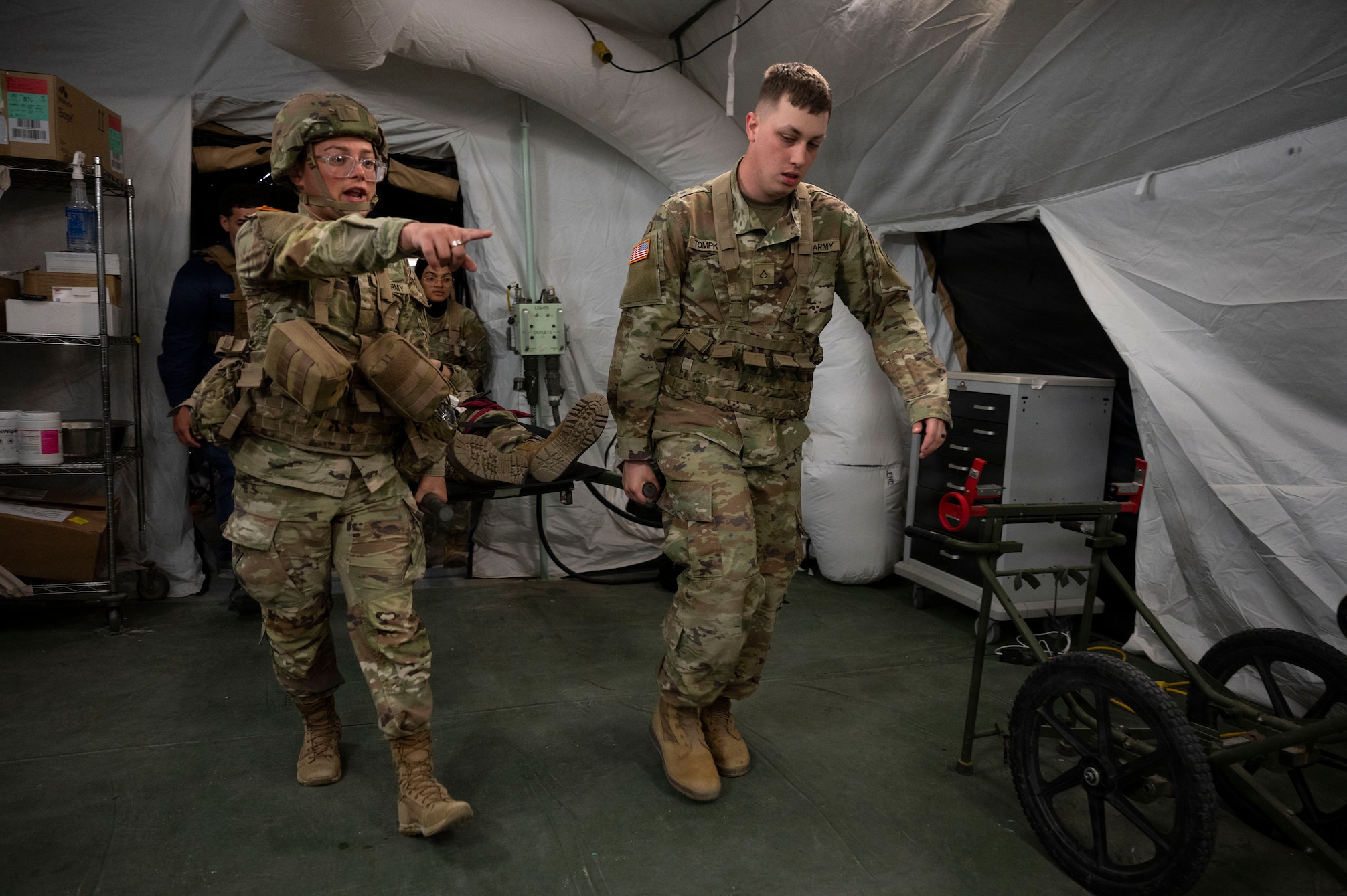 Medical Education and Training Campus Pharmacy Technician course students, carry mock patients during a simulated mass casualty training event at Joint Base San Antonio-Camp Bullis, Texas, March 5, 2026. A mass casualty, or MASCAL, scenario trains students to challenge their ability to work under pressure, prioritize, and manage pharmaceutical resources. (U.S. Air Force photo by Melissa Hydrick)