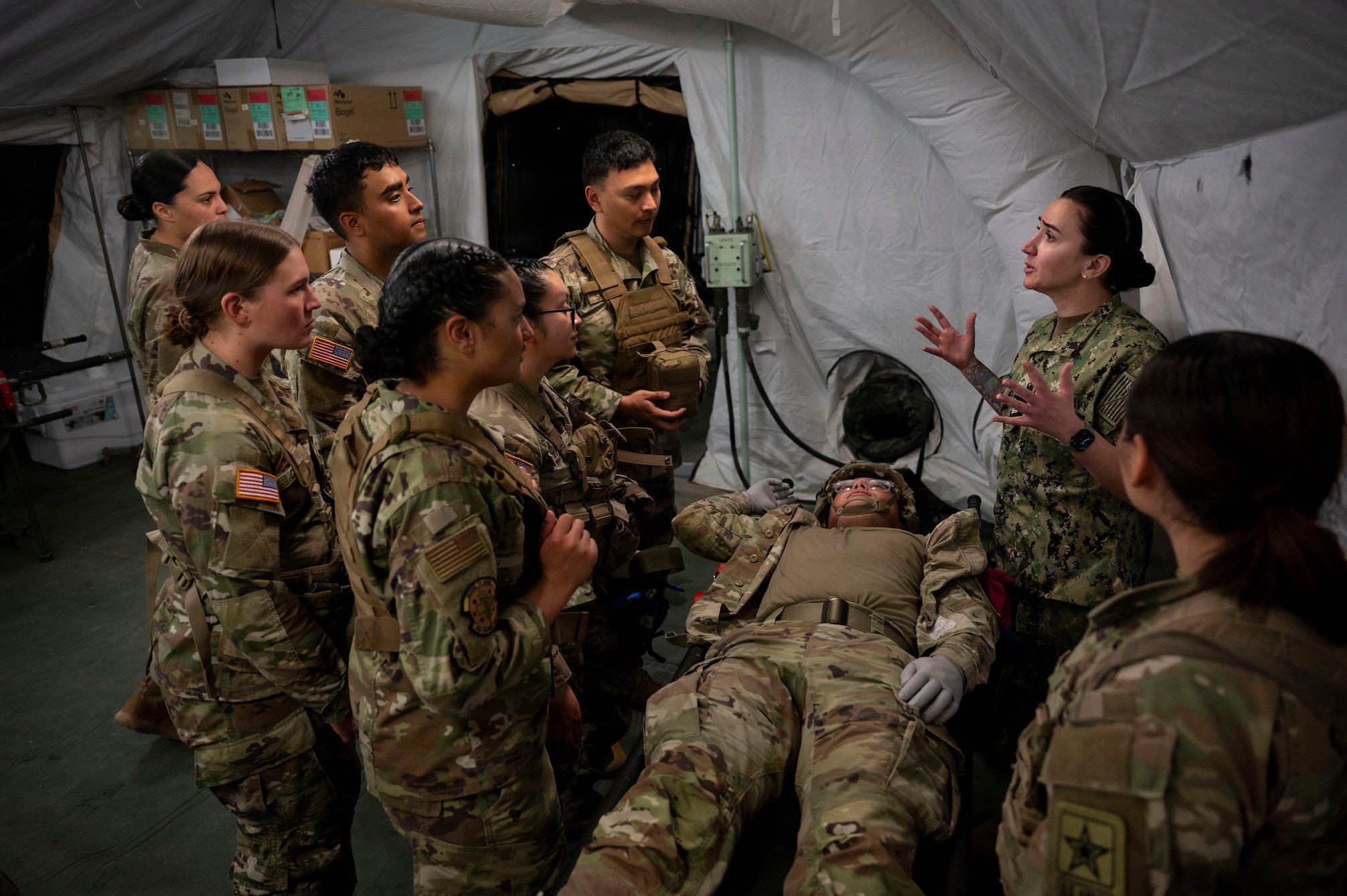 U.S. Navy Petty Officer 1st Class Berisa Moloian, top right, Medical Education and Training Campus Pharmacy Technician course instructor, teaches patient care during a simulated mass casualty training event at Joint Base San Antonio-Camp Bullis, Texas, March 5, 2026. A mass casualty, or MASCAL, scenario trains students to challenge their ability to work under pressure, prioritize, and manage pharmaceutical resources. (U.S. Air Force photo by Melissa Hydrick)