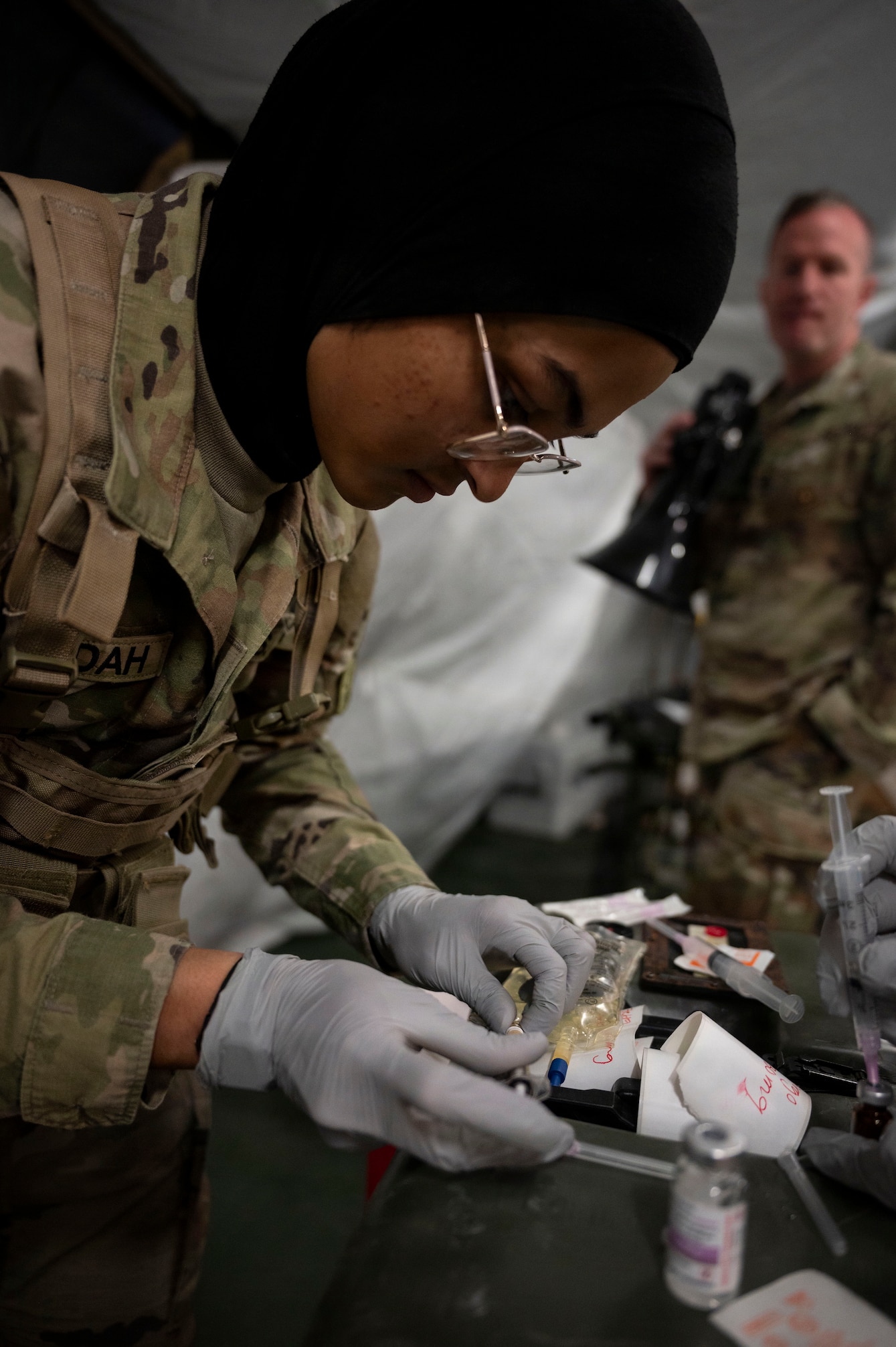 U.S. Army Pfc. Nur Syahidah, Medical Education and Training Campus Pharmacy Technician course student, prepares pain medication for mock patients during a simulated mass casualty training event at Joint Base San Antonio-Camp Bullis, Texas, March 5, 2026. A mass casualty, or MASCAL, scenario trains students to challenge their ability to work under pressure, prioritize, and manage pharmaceutical resources. (U.S. Air Force photo by Melissa Hydrick)