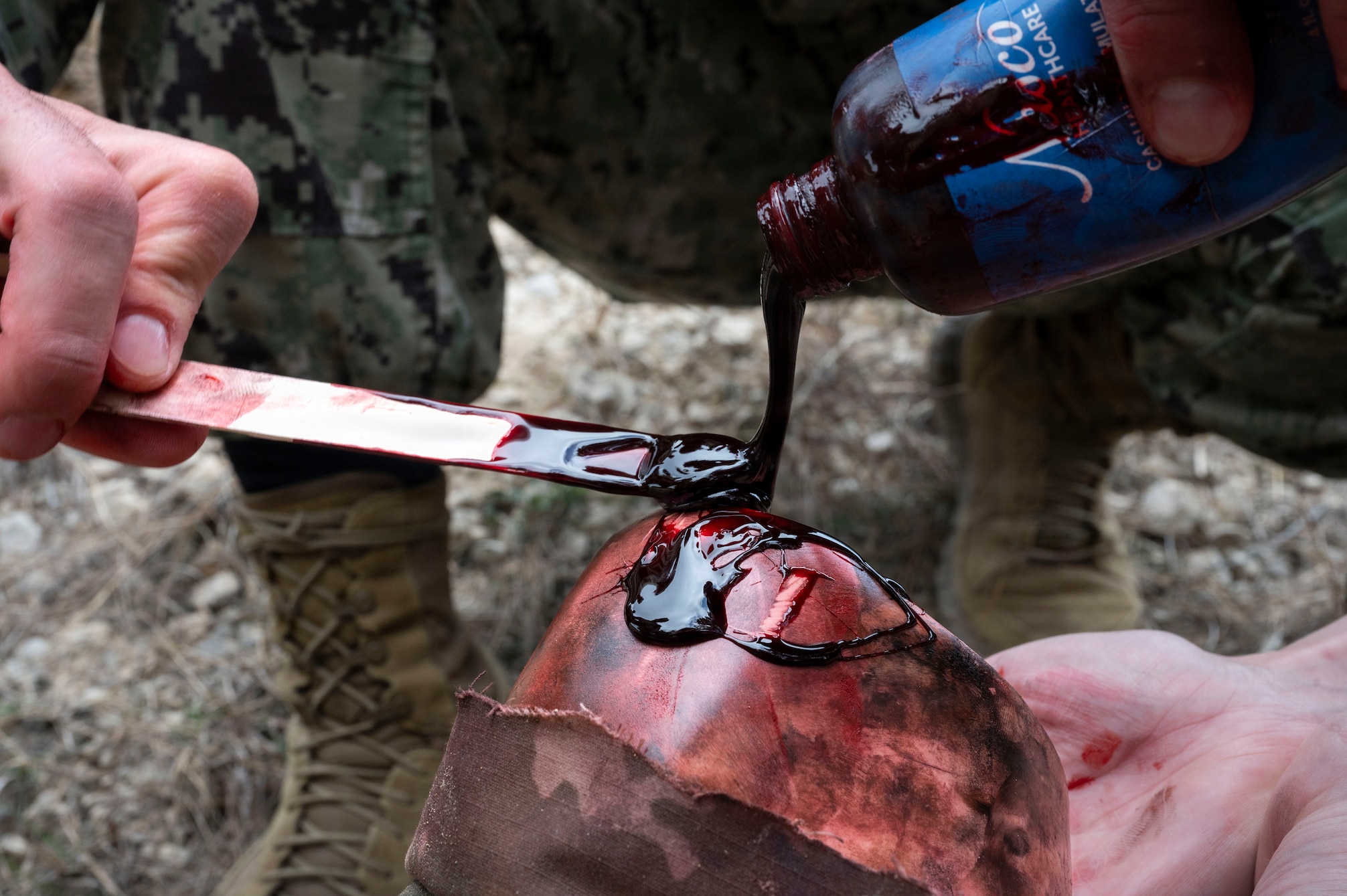 Moulage makeup is applied to mannequins for a field training exercise at Joint Base San Antonio-Camp Bullis, Texas, March 4, 2026. Moulage creates a high-pressure, realistic environment, allowing trainees to experience the shock of seeing severe trauma, such as burns, gunshots, or shrapnel wounds, which improves retention and prepares them for real-world scenarios. (U.S. Air Force photo by Melissa Hydrick)