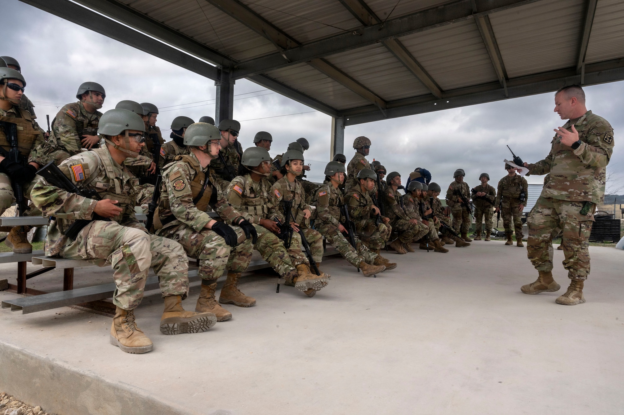 U.S. Army Sgt. 1st Class Travis Housekeeper, Medical Education and Training Campus Pharmacy Technician program instructor, briefs students during the field training exercise (FTX) at Joint Base San Antonio-Camp Bullis, Texas, March 4, 2026. The FTX trains and assesses Soldiers and Airmen on warrior tasks and battle drills and their occupational specific tasks to help sustain proficiency and readiness. (U.S. Air Force photo by Melissa Hydrick)